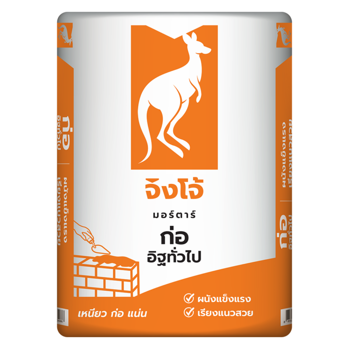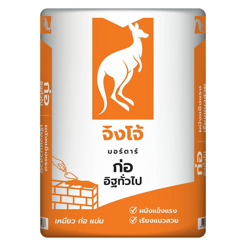 จิงโจ้ส้ม ก่ออิฐทั่วไป เป็นปูนก่อสำเร็จรูปคุณภาพสูงที่ผสมมาแล้วในอัตราส่วนเหมาะสม เพียงเติมน้ำก็พร้อมใช้งานทันที เหมาะสำหรับงานก่ออิฐมอญ อิฐบล็อก และอิฐขาว มีสารเพิ่มความเหนียวและคุณสมบัติการยึดเกาะสูง ทำให้ก่อได้แน่น แข็งแรง ลดการแตกร้าว ใช้ได้ทั้งภายในและภายนอก ทนต่อการใช้งานหนักและสภาพแวดล้อมที่เปลี่ยนแปลง